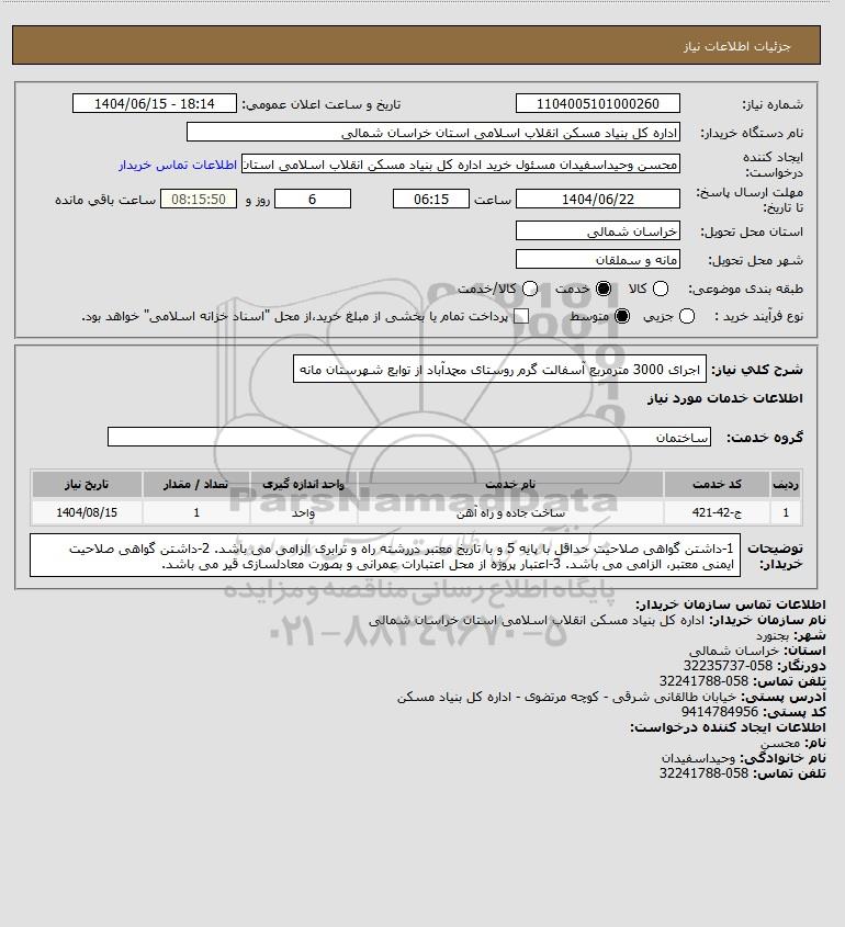 شرح کلی نیاز: اجرای 3000 مترمربع آسفالت گرم روستای محمدآباد از توابع شهرستان مانه