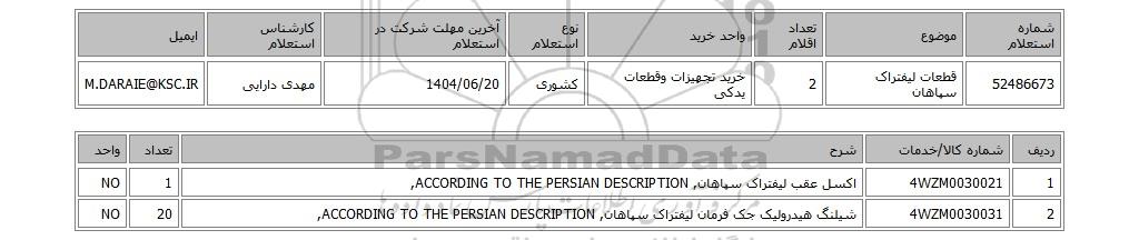| 52486673 | قطعات لیفتراک سپاهان | 2 | خرید تجهیزات وقطعات یدکی | کشوری | 1404/06/20 | مهدی دارایی | M.DARAIE@KSC.IR |