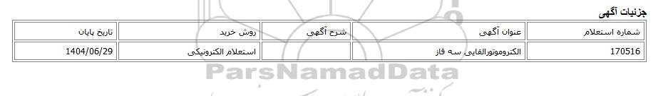 | 170516 | الکتروموتورالقایی سه فاز | استعلام الکترونیکی | 1404/06/29 |