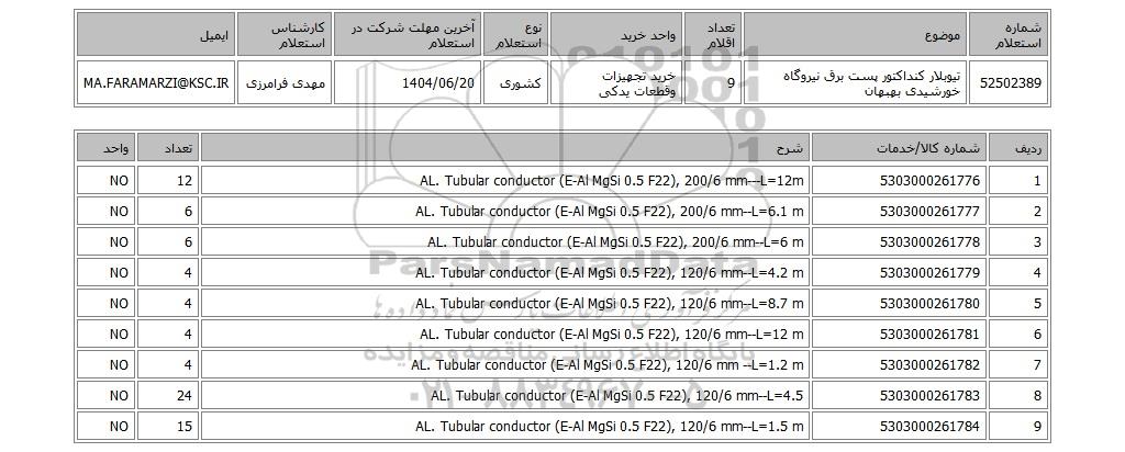 | 52502389 | تیوبلار کنداکتور پست برق نیروگاه خورشیدی بهبهان | 9 | خرید تجهیزات وقطعات یدکی | کشوری | 1404/06/20 | مهدی فرامرزی | MA.FARAMARZI@KSC.IR |