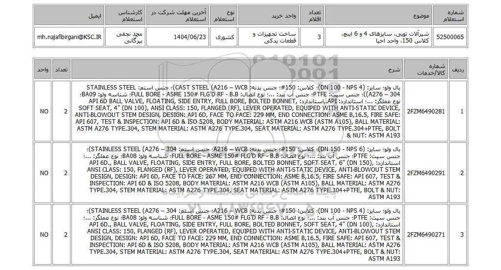 | 52500065 | شیرآلات توپی، سایزهای 4 و 6 اینچ، کلاس 150، واحد احیا | 3 | ساخت تجهیزات و قطعات یدکی | کشوری | 1404/06/23 | محمد نجفی بیرگانی | mh.najafibirgani@KSC.IR |