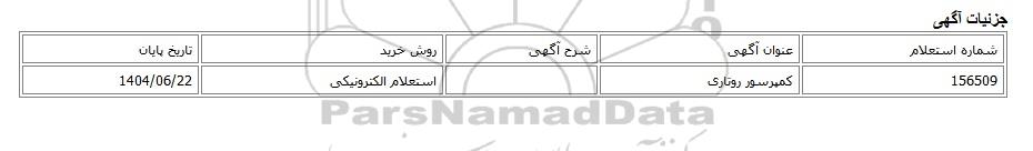 | 156509 | کمپرسور روتاری | استعلام الکترونیکی | 1404/06/22 |