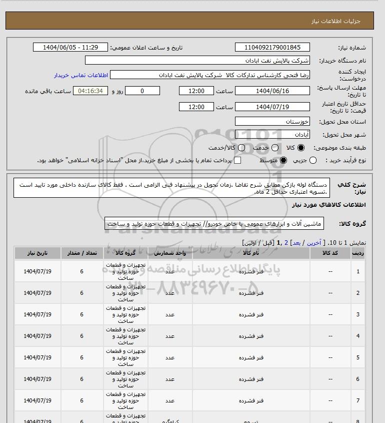 | 1 | -- | فنر فشرده | عدد | تجهیزات و قطعات حوزه تولید و ساخت | 6 | 1404/07/19 |
