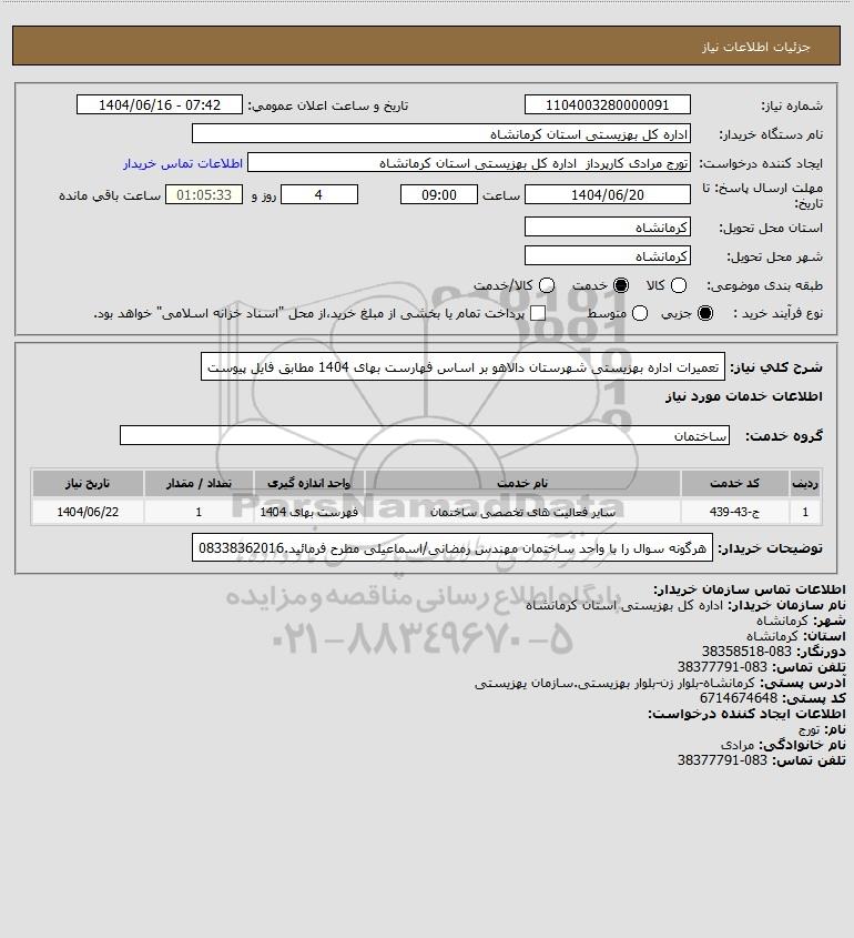 شرح کلی نیاز: تعمیرات اداره بهزیستی شهرستان دالاهو بر اساس فهارست بهای 1404 مطابق فایل پیوست