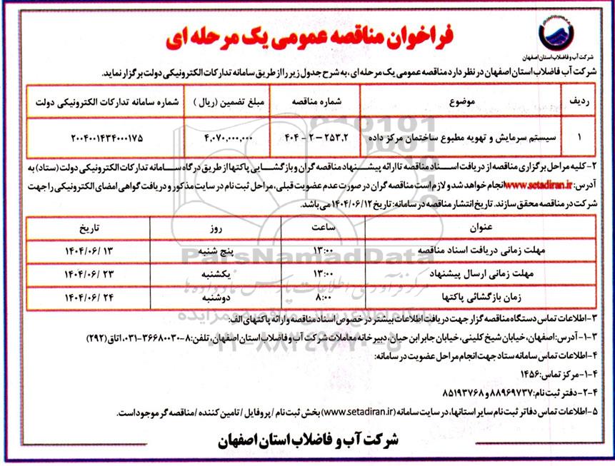 | 1 | سیستم سرمایش و تهویه مطبوع ساختمان مرکز داده | 253.2 - 2 - 404 | 4.070.000.000 | 2004001434000175 |