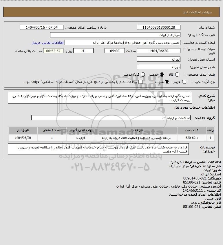 شرح کلی نیاز: تعمیر، نگهداری، پشتیبانی، بروزرسانی، ارائه مشاوره فنی و نصب و راه اندازی تجهیزات شبکه وسخت افزار و نرم افزار به شرح پیوست قرارداد
