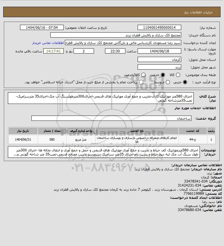 شرح کلی نیاز: اجرای 580متر موزاییک کاری-تخریب و جمع آوری موزاییک های قدیمی-اجرای300مترطولسنگ آب چک-اجرای35 مترسرامیک-نصب35مترشاخه گوزنی