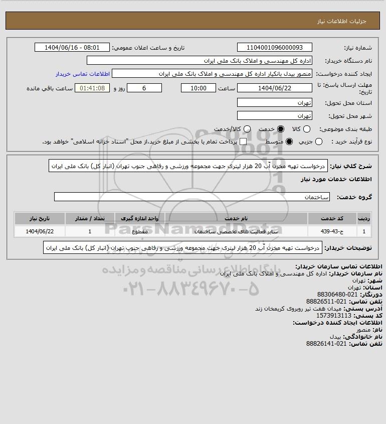 استعلام درخواست تهیه مخزن آّب 20 هزار لیتری جهت مجموعه ورزشی و رفاهی جنوب تهران (انبار کل) بانک ملی ایران, استعلام درخواست تهیه مخزن آّب 20 هزار لیتری جهت مجموعه ورزشی و رفاهی جنوب تهران (انبار کل) بانک ملی ایران
