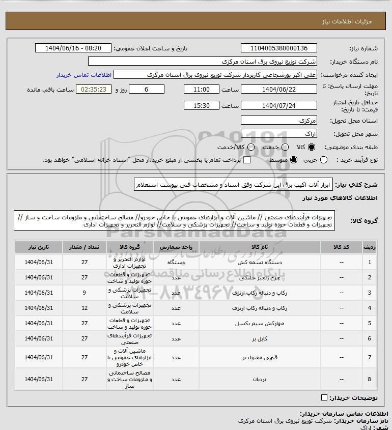 شرح کلی نیاز: ابزار آلات اکیپ برق این شرکت وفق اسناد و مشخصات فنی پیوست استعلام
