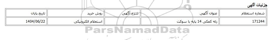 | 171244 | رله کمکی 14 پایه با سوکت | استعلام الکترونیکی | 1404/06/22 |
