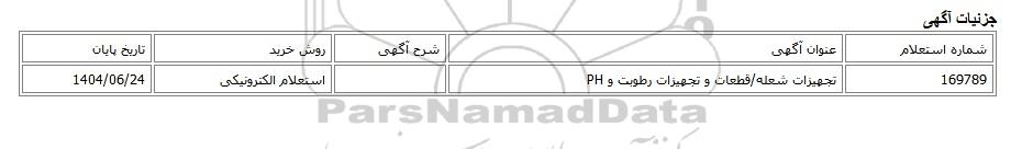 | 169789 | تجهیزات شعله/قطعات و تجهیزات رطوبت و PH | استعلام الکترونیکی | 1404/06/24 |
