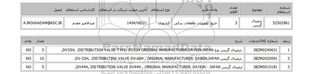 | 52502961 | ترمینال گریس | 3 | خرید تجهیزات وقطعات یدکی | کشوری | 1404/06/21 | عبدالامیر مقدم | A.MOGHADAM@KSC.IR |