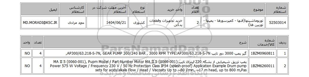 | 52503014 | توربوماشینها(فنها - کمپرسورها - پمپها - توربین ها) | 2 | خرید تجهیزات وقطعات یدکی | کشوری | 1404/06/21 | محمد مرادی | MD.MORADI@KSC.IR |