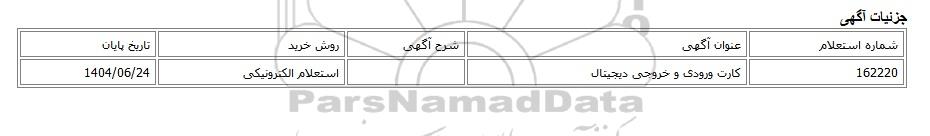 | 162220 | کارت ورودی و خروجی دیجیتال | استعلام الکترونیکی | 1404/06/24 |