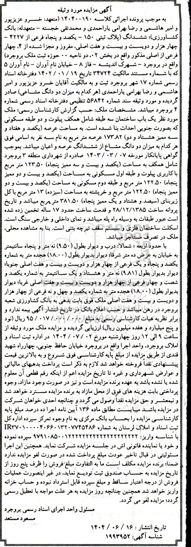 مزایده فروش ششدانگ پلاک ثبتی 150 - یکصد و پنجاه فرعی از 4227 - چهار هزار و دویست و بیست و هفت اصلی، مفروز و مجزا شده از 4، چهار فرعی از اصلی مذکور واقع در بخش 02، ناحیه 00 حوزه ثبت ملک بروجرد)