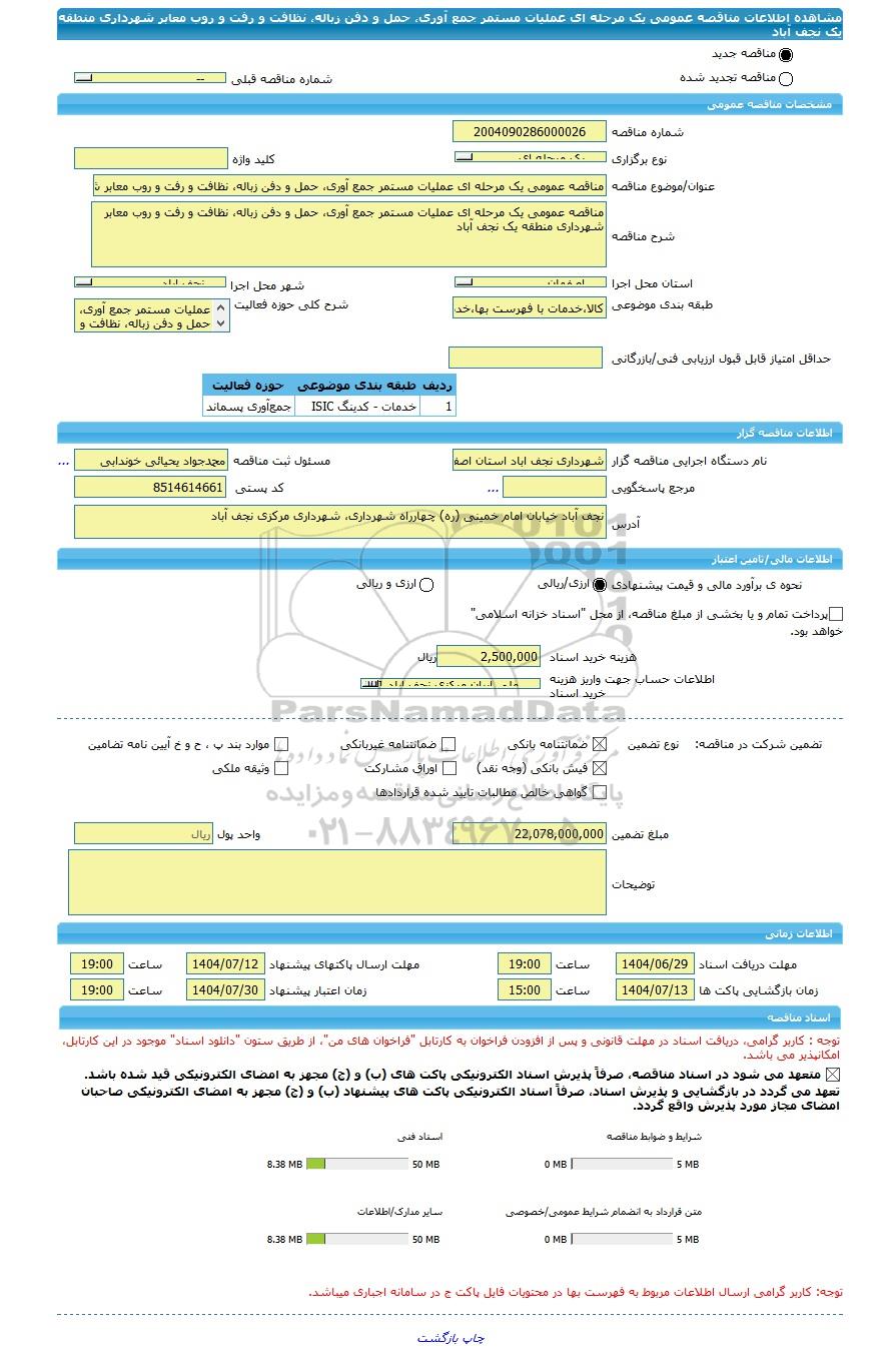 | شرح مناقصه | مناقصه عمومی یک مرحله ای عملیات مستمر جمع آوری، حمل و دفن زباله، نظافت و رفت و روب معابر شهرداری منطقه یک نجف آباد | ||||||||