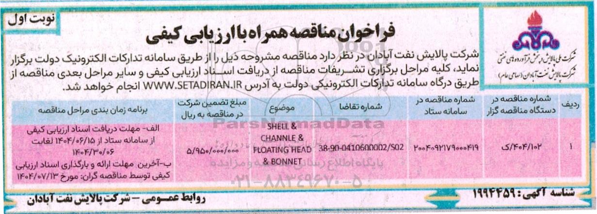 | 1 | 404/102/ک | 2004092179000419 | 38-90-04106000002/S02 | SHELL&CHANNLE&FLOATING HEAD&BONNET | 5.950.000.000 |