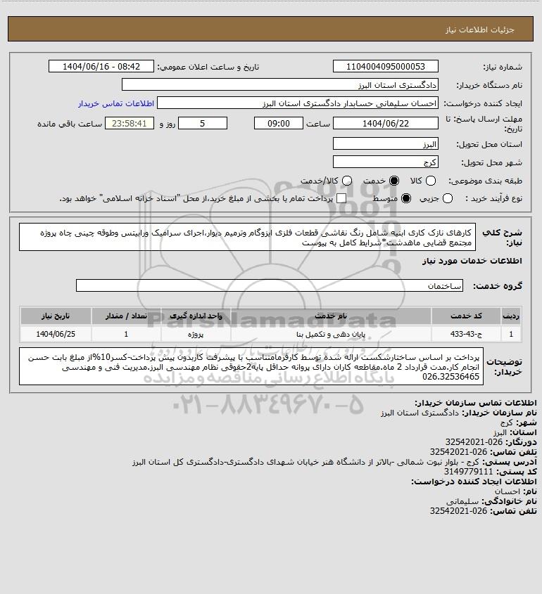 استعلام کارهای نازک کاری ابنیه شامل رنگ نقاشی قطعات فلزی ایزوگام وترمیم دیواراجرای سرامیک ورابیتس وطوقه چینی چاه پروژه مجتمع قضایی ماهدشت*شرایط کامل به پیوست, استعلام کارهای نازک کاری ابنیه شامل رنگ نقاشی قطعات فلزی ایزوگام وترمیم دیوار،اجرای سرامیک ورابیتس وطوقه چینی چاه پروژه مجتمع قضایی ماهدشت*شرایط کامل به پیوست