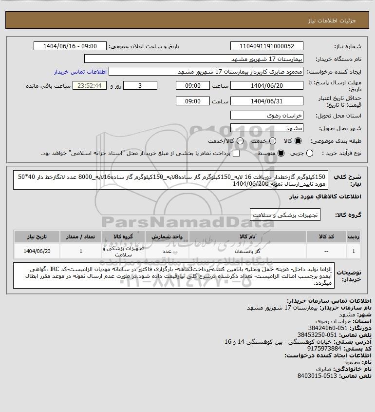 نام دستگاه خریدار:بیمارستان 17 شهریور مشهد