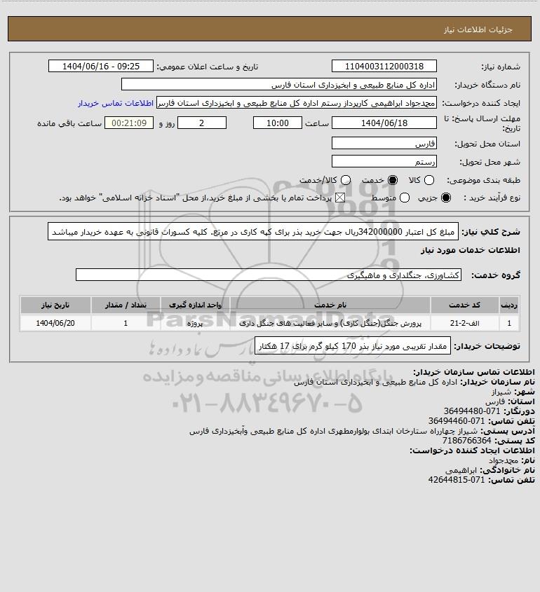 شرح کلی نیاز: مبلغ کل اعتبار 342000000ریال جهت خرید بذر برای کپه کاری در مرتع. کلیه کسورات قانونی به عهده خریدار میباشد
