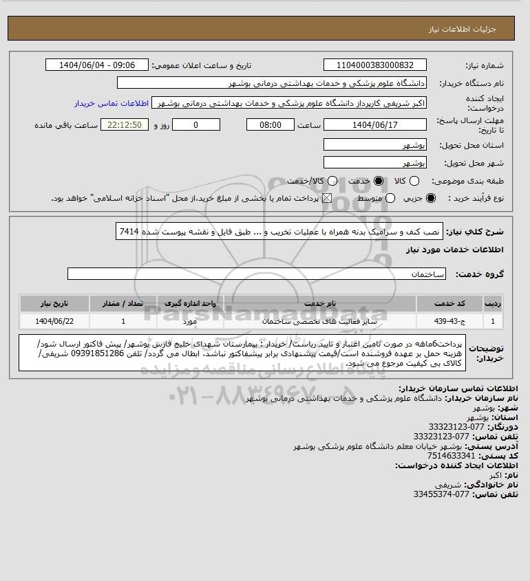 شرح کلی نیاز: نصب کنف و سرامیک بدنه همراه با عملیات تخریب و ... طبق فایل و نقشه پیوست شده 7414