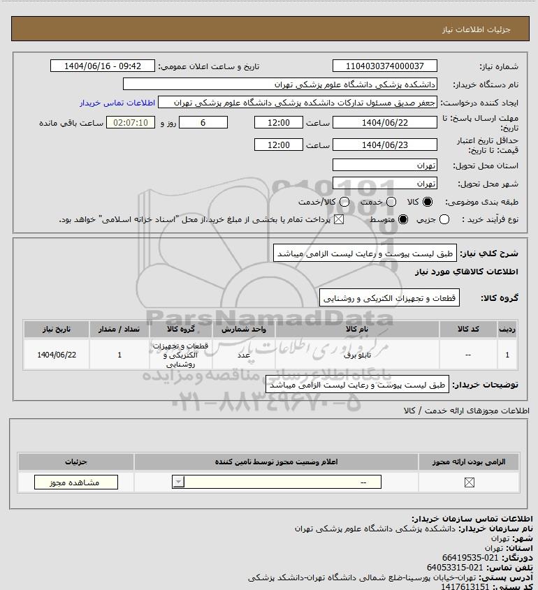 | 1 | -- | تابلو برق | عدد | قطعات و تجهیزات الکتریکی و روشنایی | 1 | 1404/06/22 |