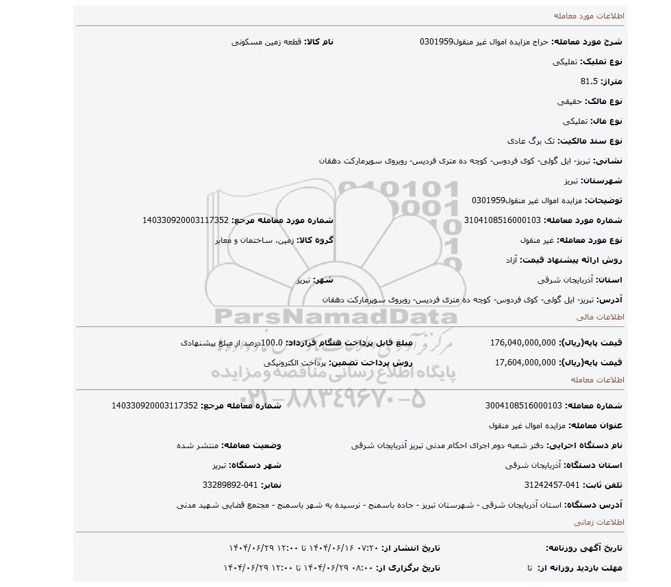 | توضیحات: مزایده اموال غیر منقول0301959 | ||