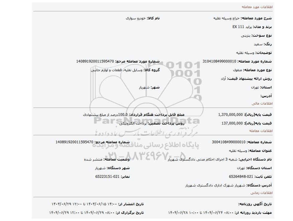 | نام دستگاه اجرایی: شعبه 3 اجرای احکام مدنی دادگستری شهریار | وضعیت معامله: منتشر شده | |