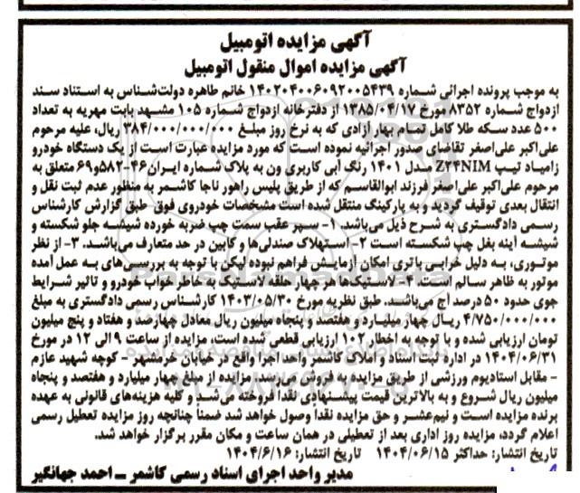 مزایده فروش یک دستگاه خودرو زامیاد مدل 1401 آبی رنگ