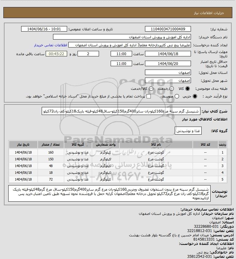 استعلام شنیسل گرم سینه مرغ160کیلو-ران سایز400گرم150کیلو-ساق48کیلو-فیله باریک18کیلو-کف ران72کیلو, استعلام شنیسل گرم سینه مرغ160کیلو-ران سایز400گرم150کیلو-ساق48کیلو-فیله باریک18کیلو-کف ران72کیلو