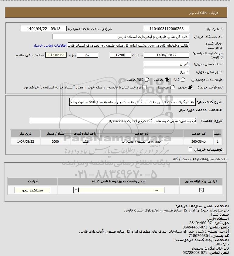شرح کلی نیاز: به کارگیری دیدبان فصلی به تعداد 2 نفر به مدت چهار ماه به مبلغ 640 میلیون ریال