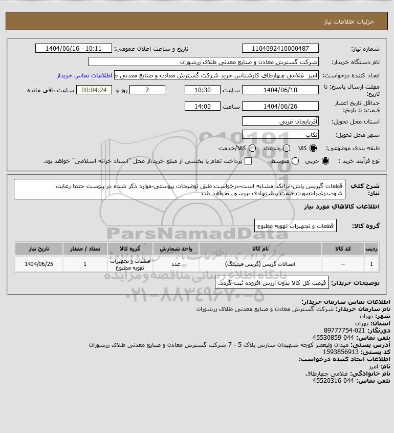 شرح کلی نیاز: قطعات گیریس پاش-ایرانکد مشابه است-درخواست طبق توضیحات پیوستی-موارد ذکر شده در پیوست حتما رعایت شود.درغیراینصورت قیمت پیشنهادی بررسی نخواهد شد
