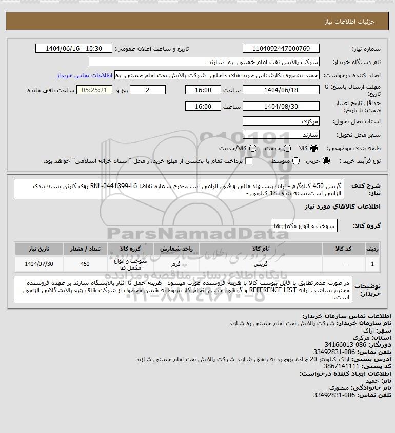 شرح کلی نیاز: گریس 450 کیلوگرم - ارائه پیشنهاد مالی و فنی الزامی است.-درج شماره تقاضا RNL-0441399-L6 روی کارتن بسته بندی الزامی است.بسته بندی 18 کیلویی -