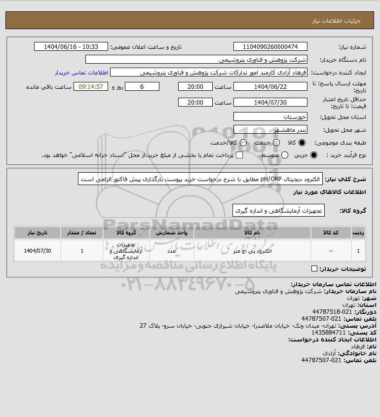 نام دستگاه خریدار:شرکت پژوهش و فناوری پتروشیمی