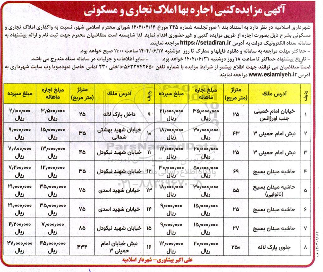 شهرداری اسلامیه در نظر دارد به استناد بند 1 صورتجلسه شماره 245 مورخ 1404.4.16 شورای محترم اسلامی شهر نسبت به واگذاری املاک تجاری و مسکونی بشرح ذیل بصورت اجاره از طریق مزایده کتبی و غیر حضوری اقدام نماید لذا شایسته است متقاضان محترم جهت ثبت نام و ارائه پیشنهاد به سامانه تدارکات الکترونیک دولت ستاد ایران  مراجعه نمایند