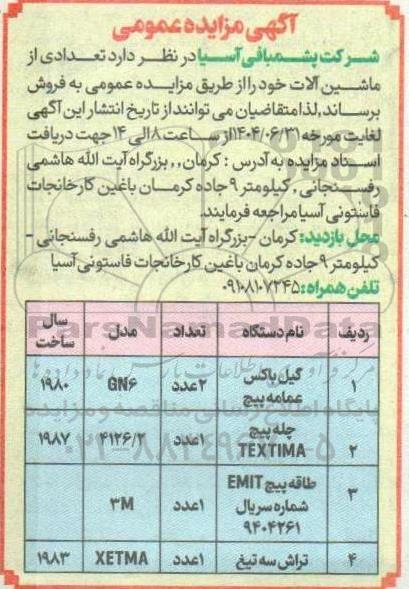 شرکت پشمبافی آسیا در نظر دارد  تعدادی از ماشین آلات خود را از طریق مزایده عمومی به فروش برساند. لذا متقاضیان میتوانند از تاریخ انتشار این آگهی لغایت مورخه 1404.06.31 از ساعت 8 الی 14 جهت دریافت اسناد مزایده به آدرس : کرمان - بزرگراه آیت الله هاشمی رفسنجانی -  کیلومتر 9 جاده کرمان باغین - کارخانجات فاستونی آسیا مراجعه فرمایند.