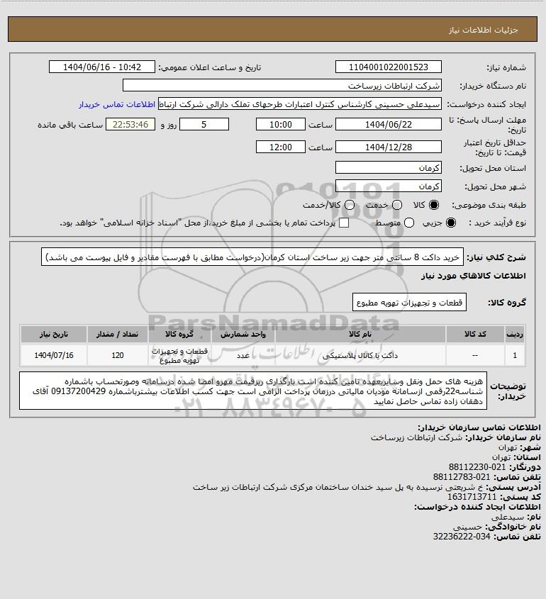 شرح کلی نیاز: خرید داکت 8 سانتی متر جهت زیر ساخت استان کرمان(درخواست مطابق با فهرست مقادیر و فایل پیوست می باشد)