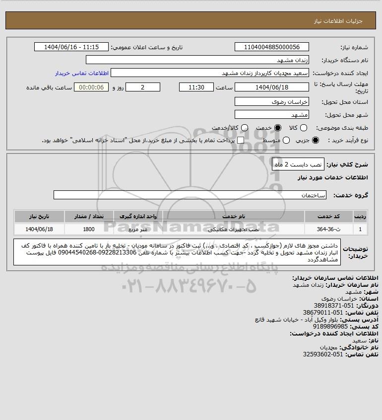 استعلام بها و موضوع استعلام استعلام نصب دابست 2 ماه به اطلاع کلیه شرکتها و افراد متخصص واجد شرایط میرساند، آگهی گذار در نظر دارد از طریق استعلام بها، نسبت به انتخاب و دریافت پیشنهادات اقدام نماید. این استعلام با کد آگهی ثبت شده در سامانه خبرگزاری پارس نماد : 9511834 منتشر شده است. مشخصات استعلام : تاریخ شروع استعلام: 1404/06/16 آخرین مهلت ارسال پیشنهاد قیمت : 1404/06/18 و محل اجرای پروژه : استان خراسان رضوی میباشد. استعلام قیمت مورد درخواست : استعلام نصب دابست 2 ماه با دستهبندیهای تخصصی و گروه های مرتبط : داربست های فلزی, ساختمان, استعلام اطلاع رسانی میگردد.