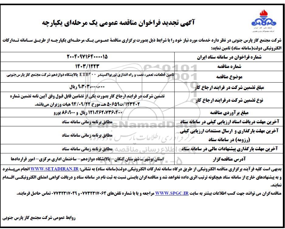 موضوع مناقصه تامین قطعات، تعمیر، نصب و راه اندازی توربواکسپندر ETB300 پالایشگاه دوازدهم شرکت مجتمع گاز پارس جنوبی