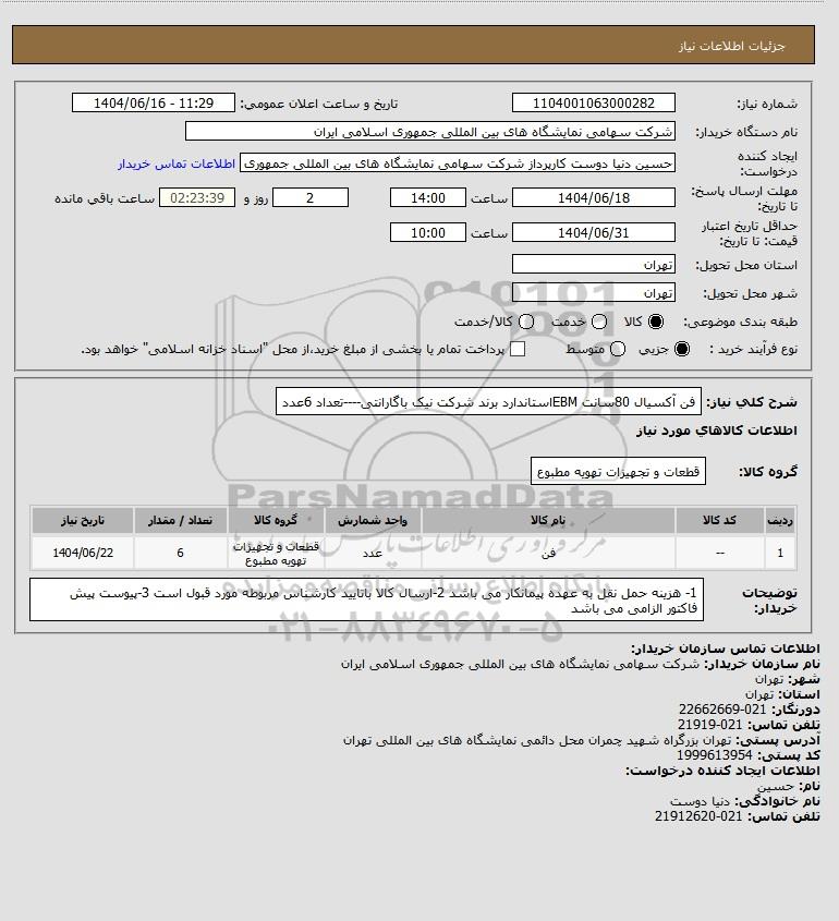 شرح کلی نیاز: فن آکسیال 80سانت EBMاستاندارد برند شرکت نیک باگارانتی----تعداد 6عدد