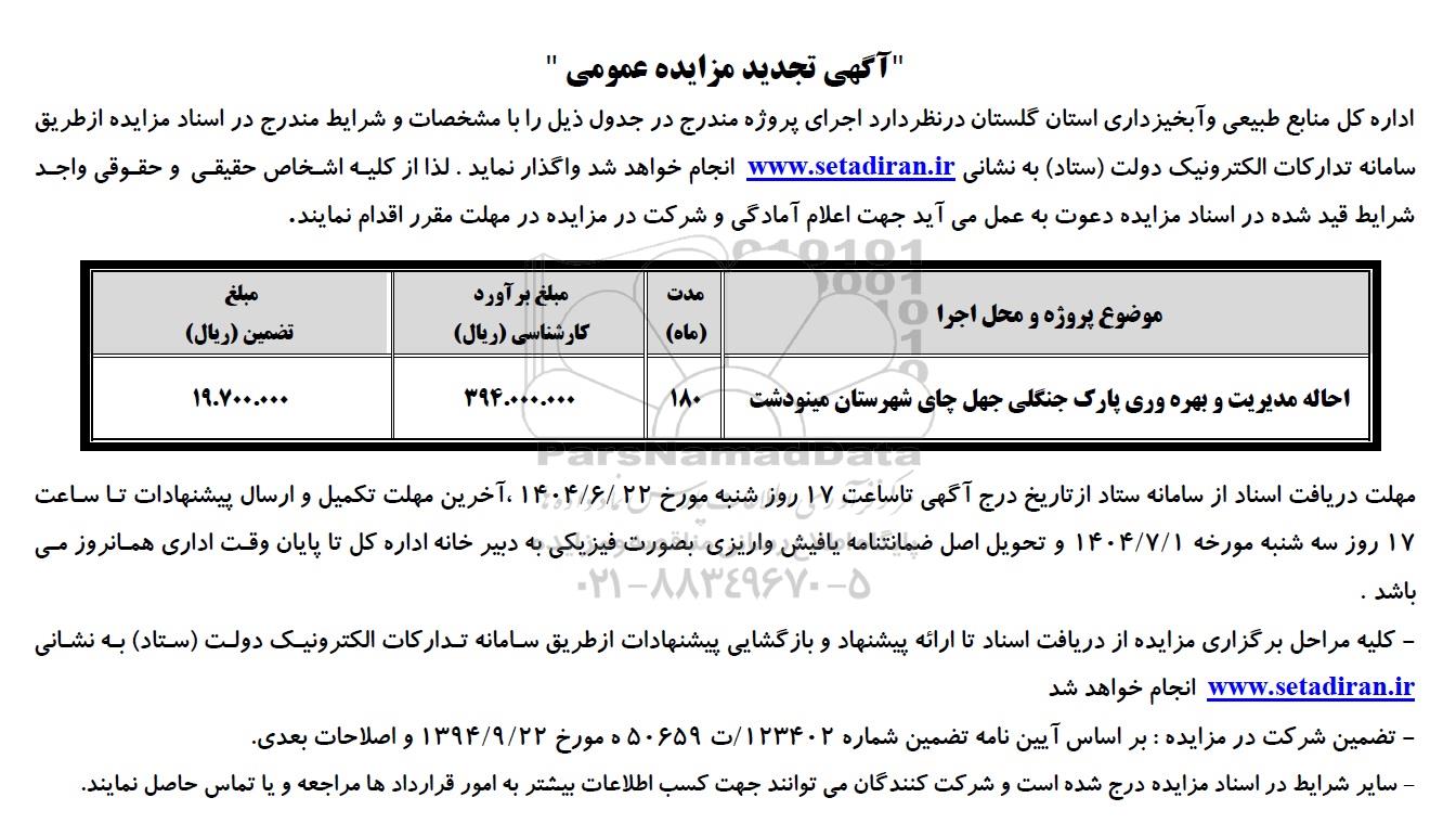 | احاله مدیریت و بهره وری پارک جنگلی چهل چای شهرستان مینودشت | 180 | 394.000.000 | 19.700.000 |