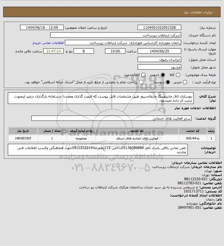 شرح کلی نیاز: بهسازی اتاق مانیتورینگ وارتقاءسرور طبق مشخصات فایل پیوست که قیمت گذاری ومجددا درسامانه بارگذاری درغیر اینصورت ترتیب اثر داده نمیشود