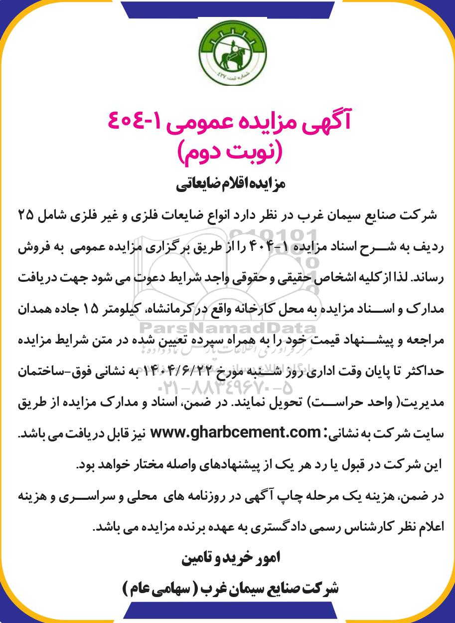 شرکت صنایع سیمان غرب در نظر دارد انواع ضایعات فلزی و غیرفلزی شامل 25 ردیف به شرح اسناد مزایده 1- 404 را از طریق برگزاری مزایده عمومی به فروش رساند. لذا از کلیه اشخاص حقیقی و حقوقی واجد شرایط دعوت می شود جهت دریافت مدارک و اسناد مزایده به محل کارخانه واقع در کرمانشاه کیلومتر 15 جاده همدان مراجعه و پیشنهاد قیمت خود را به همراه سپرده تعیین شده در متن شرایط مزایده حداکثر تا پایان وقت اداری روز شنبه مورخ 1404.06.22 به نشانی فوق - ساختمان مدیریت - واحد حراست تحویل نمایند. در ضمن اسناد و مدارک مزایده از طریق سایت شرکت به نشانی WWW.GHARBCEMENT.COM نیز قابل دریافت می باشد. این شرکت در قبول یا رد هر یک از پیشنهادهای واصله مختار خواهد بود. در ضمن هزینه یک مرحله چاپ آگهی در روزنامه های محلی و سراسری و هزینه اعلام نظر کارشناس رسمی دادگستری به عهده برنده مزایده می باشد.