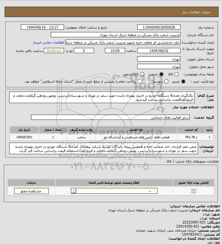 توضیحات خریدار:ضمن عقد قرارداد، اخذ ضمانت نامه و همچنین بیمه رانندگان توسط شرکت پیمانکار، تعداد8 دستگاه خودرو در اختیار بهمراه راننده جهت سفر در تهران و شهرستان(پردیس، بومهن،رودهن،گیلاوند،دماوند و فیروزکوه).استعلام قیمت براساس ساعت قید گردد.