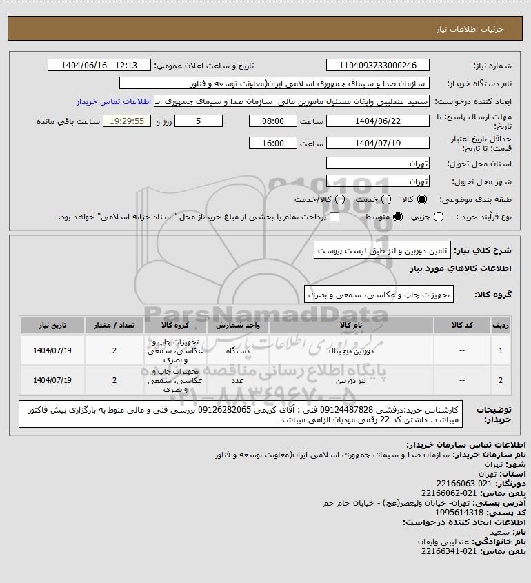 استعلام تامین دوربین و لنز طیق لیست پیوست, استعلام تامین دوربین و لنز طیق لیست پیوست