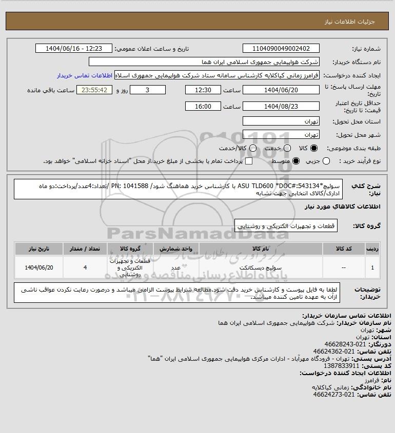 شرح کلی نیاز: سوئیچ*ASU TLD600 *DOC#:543134 با کارشناس خرید هماهنگ شود/ PN: 1041588 /تعداد:4عدد/پرداخت:دو ماه اداری/کالای انتخابی جهت تشابه