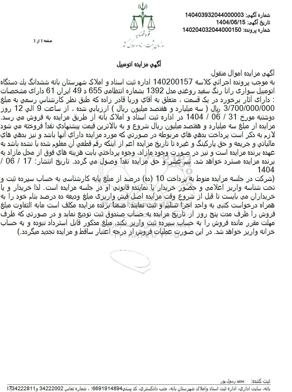 مزایده فروش یک دستگاه اتومبیل سواری رانا سفید رنگ