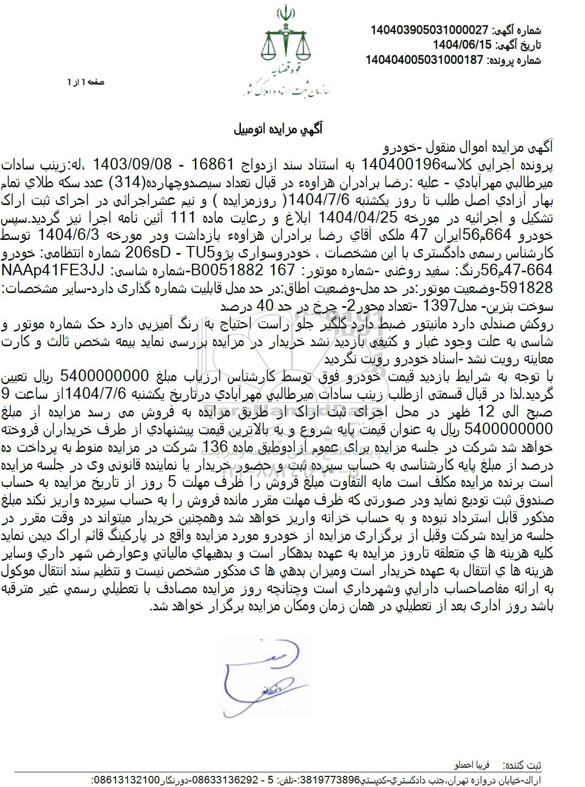 مزایده فروش یک دستگاه خودرو پژو TU5 -206SD مدل 1397