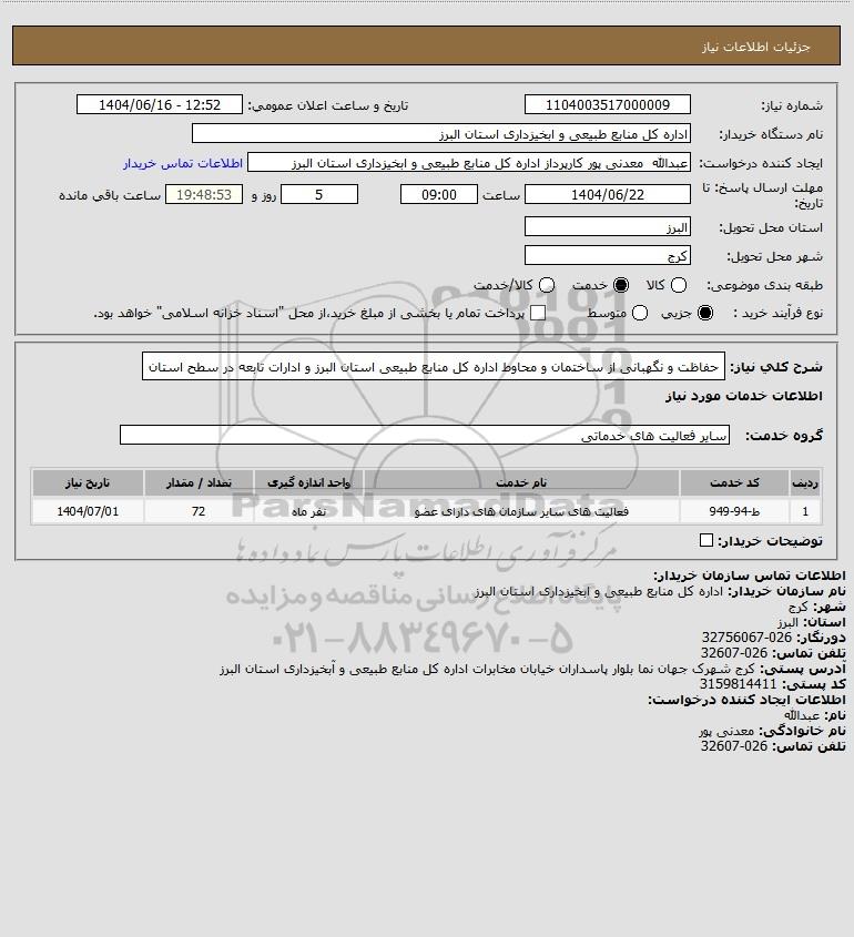 شرح کلی نیاز: حفاظت و نگهبانی از ساختمان و محاوط اداره کل منابع طبیعی استان البرز و ادارات تابعه در سطح استان