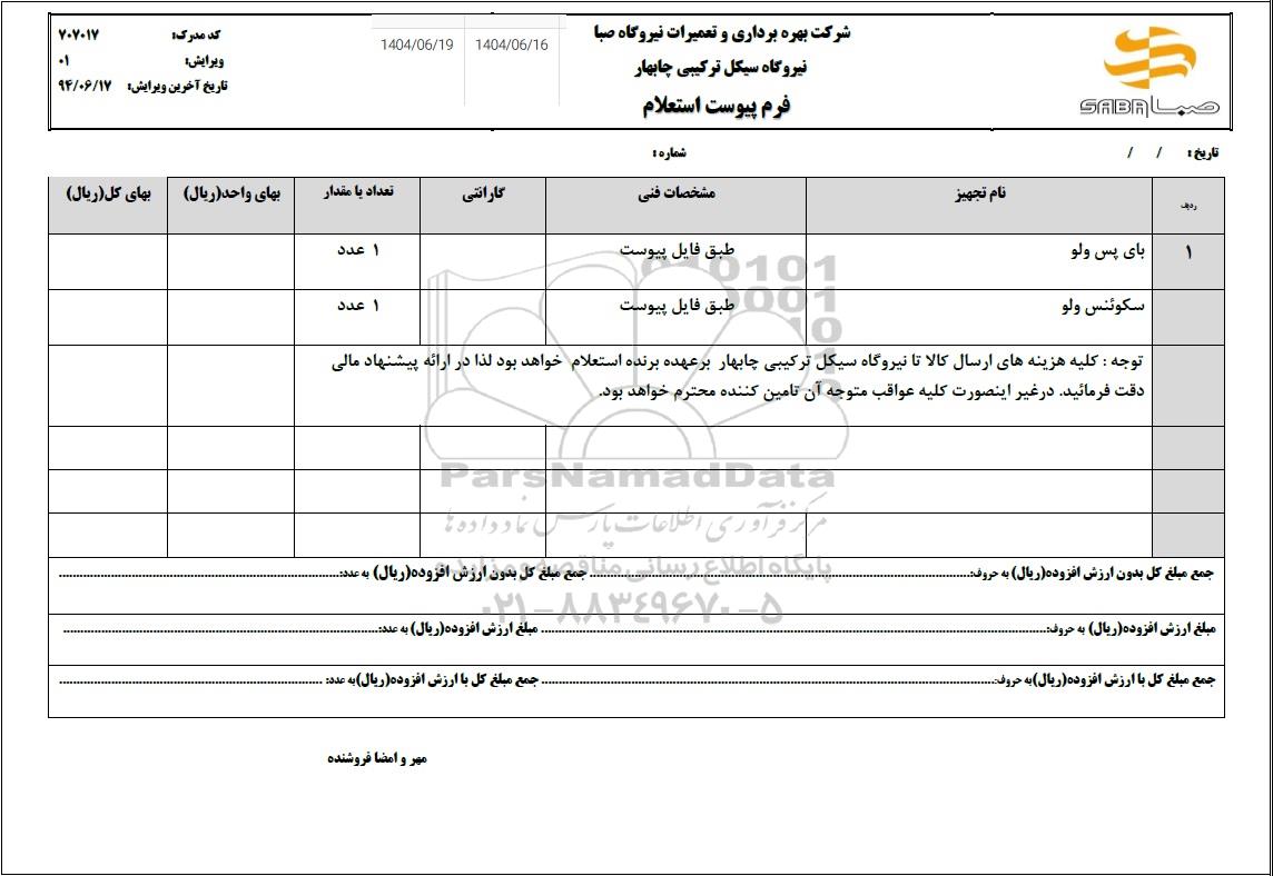 استعلام بها و موضوع استعلام استعلام بای پس ولو و سکوئنس ولو به اطلاع کلیه شرکتها و افراد متخصص واجد شرایط میرساند، آگهی گذار در نظر دارد از طریق استعلام بها، نسبت به انتخاب و دریافت پیشنهادات اقدام نماید. این استعلام با کد آگهی ثبت شده در سامانه خبرگزاری پارس نماد : 9513092 منتشر شده است. مشخصات استعلام : تاریخ شروع استعلام: 1404/06/16 آخرین مهلت ارسال پیشنهاد قیمت : 1404/06/19 و محل اجرای پروژه : استان سیستان و بلوچستان میباشد. استعلام قیمت مورد درخواست : استعلام بای پس ولو و سکوئنس ولو با دستهبندیهای تخصصی و گروه های مرتبط : شیرآلات, نیروگاه, تجهیزات برق و الکترونیک, استعلام اطلاع رسانی میگردد. شرایط شرکت در استعلام آنلاین : ابتدا ثبت نام در سامانه استعلام پارس نماد و تکمیل مدارک موردنیاز و بارگذاری در سامانه رعایت تمامی ضوابط و الزامات مندرج در اسناد استعلام است.